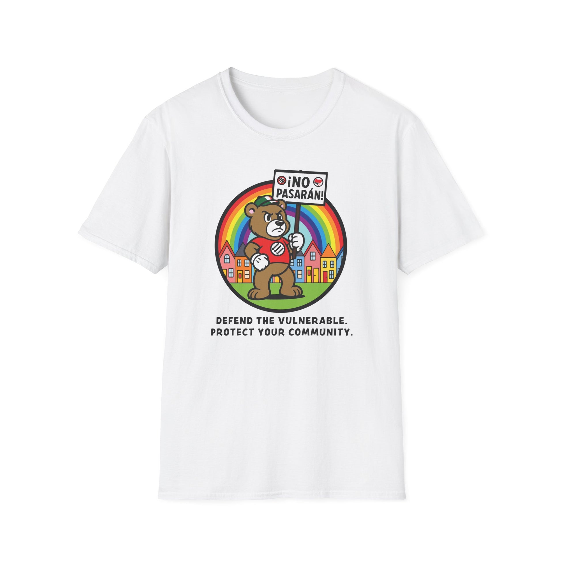 Stand up. Speak out. Protect your community. This bold and empowering unisex t-shirt from Curio Memento delivers a message that’s impossible to ignore: ¡No Pasarán! – They Shall Not Pass! Featuring a fierce bear holding a protest sign against fascism, framed by a rainbow of unity and rows of colorful houses symbolizing community strength, this design embodies courage, inclusivity, and solidarity.