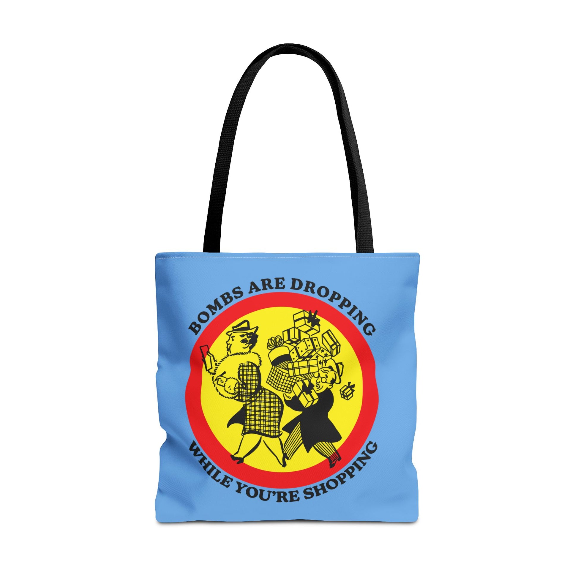 Loud, pointed, and impossible to ignore—this tote bag is designed to make a statement in a world that desperately needs one. Featuring two overloaded shoppers surrounded by the phrase Bombs Are Dropping While You're Shopping, this eye-catching design confronts the numbing effect of mass consumerism and the willful apathy embedded in capitalist culture.