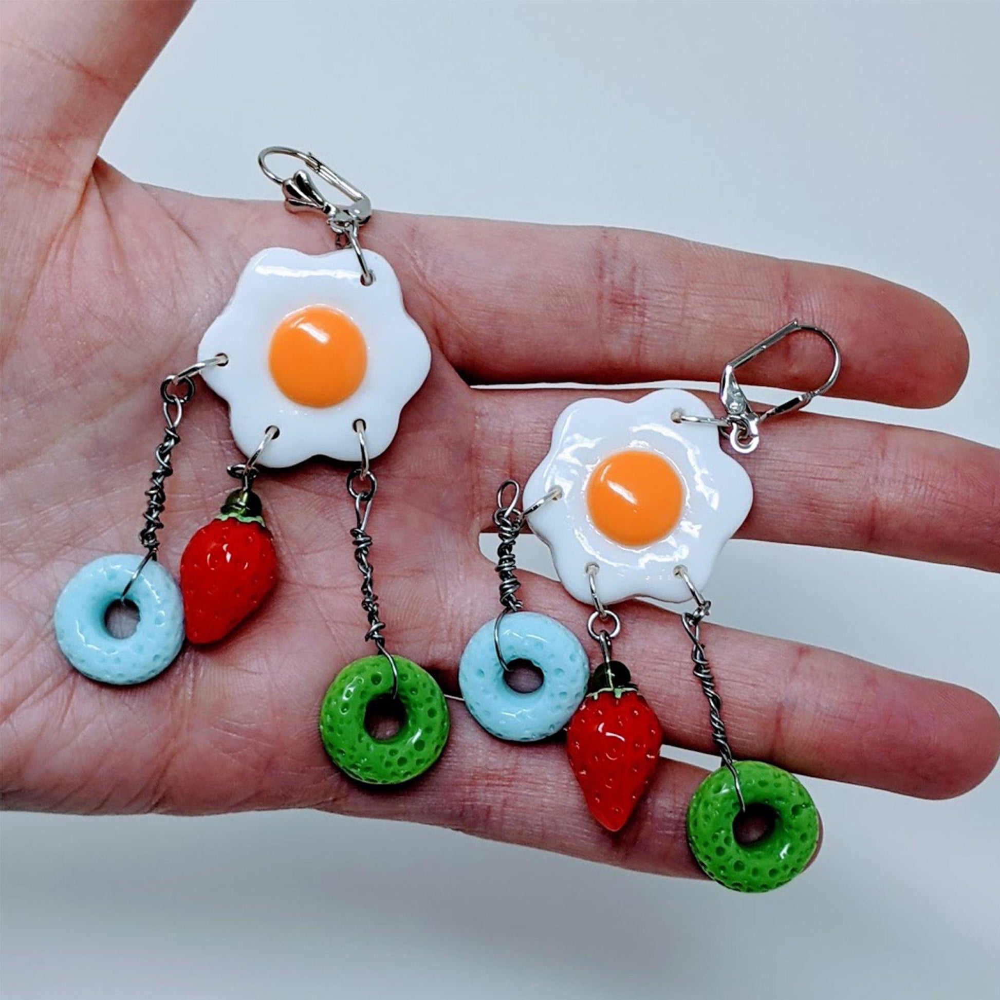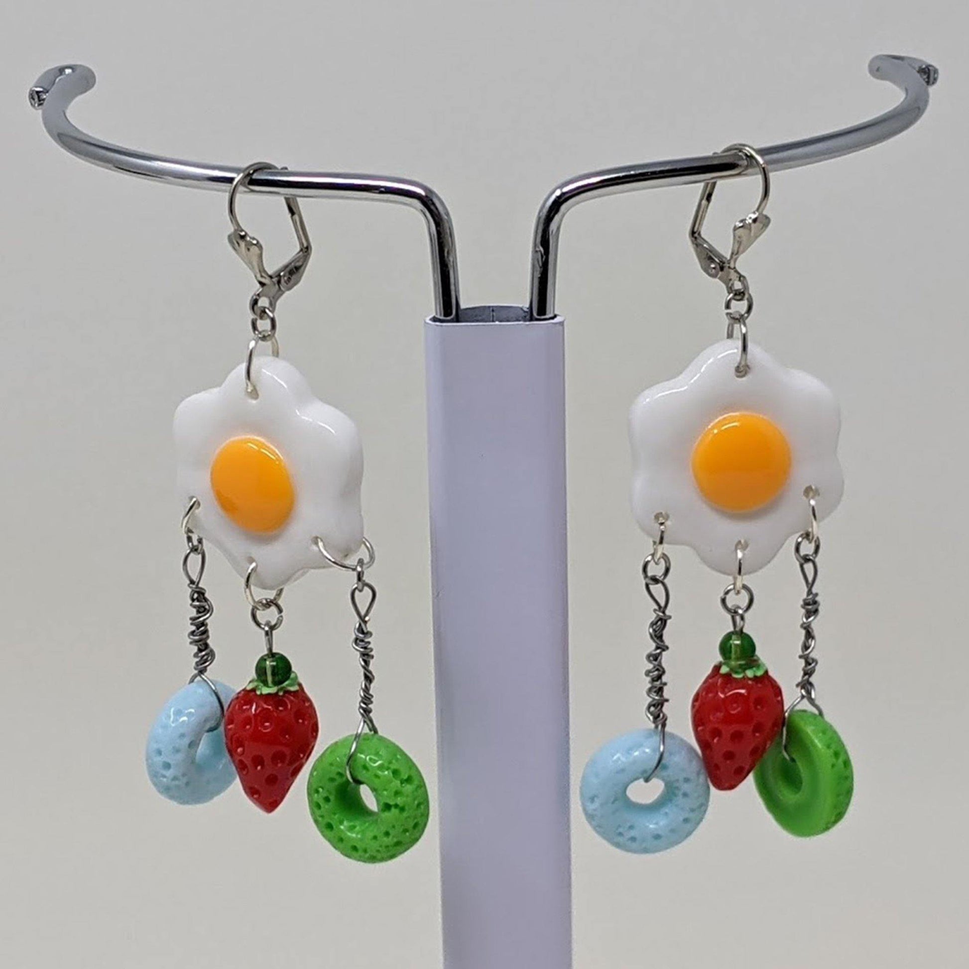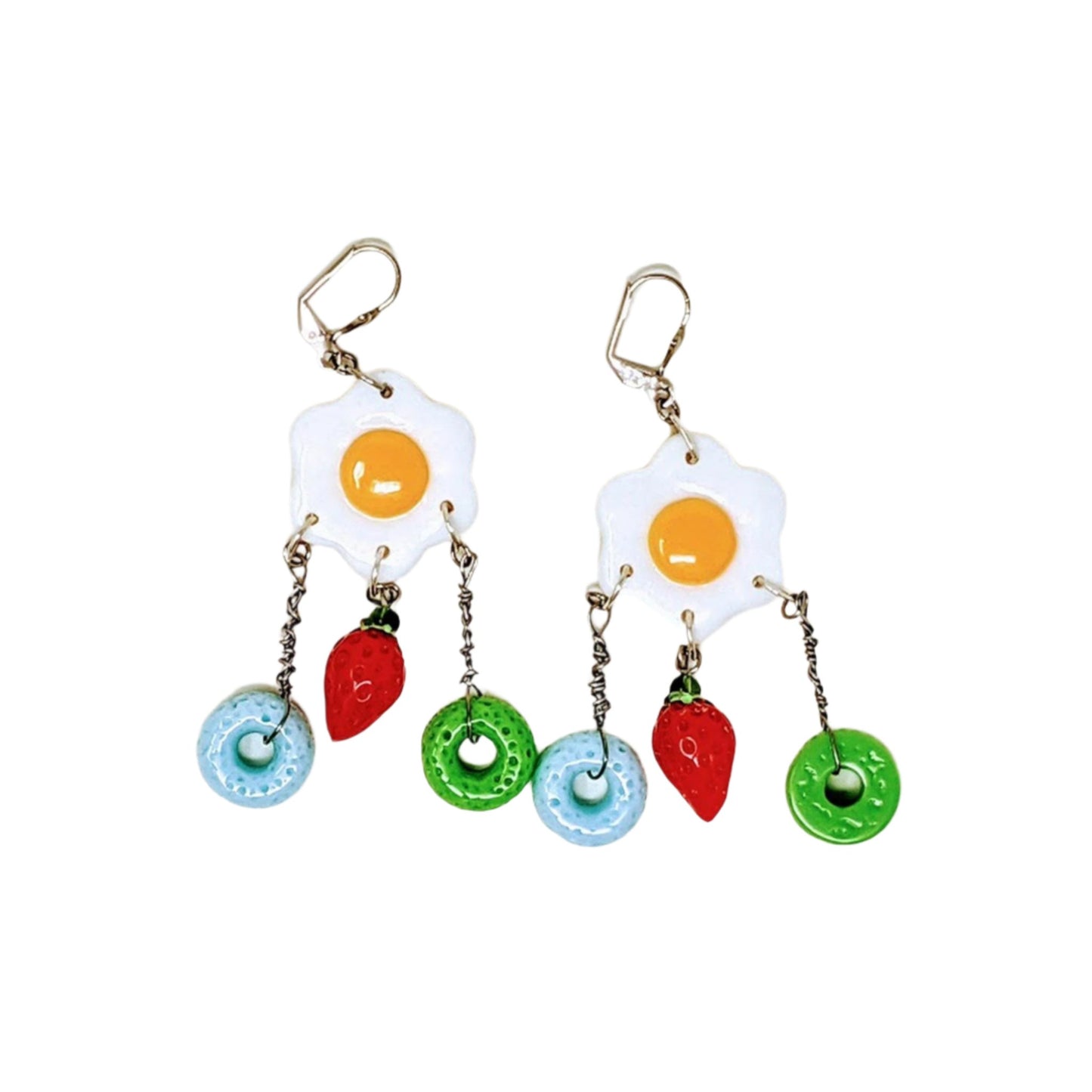 The perfect accessory for brunch. These fun earrings are made with wire, silver findings, miniature resin eggs, resin cereal loops and resin strawberries. These earrings are one of a kind and handmade by Curio Memento.