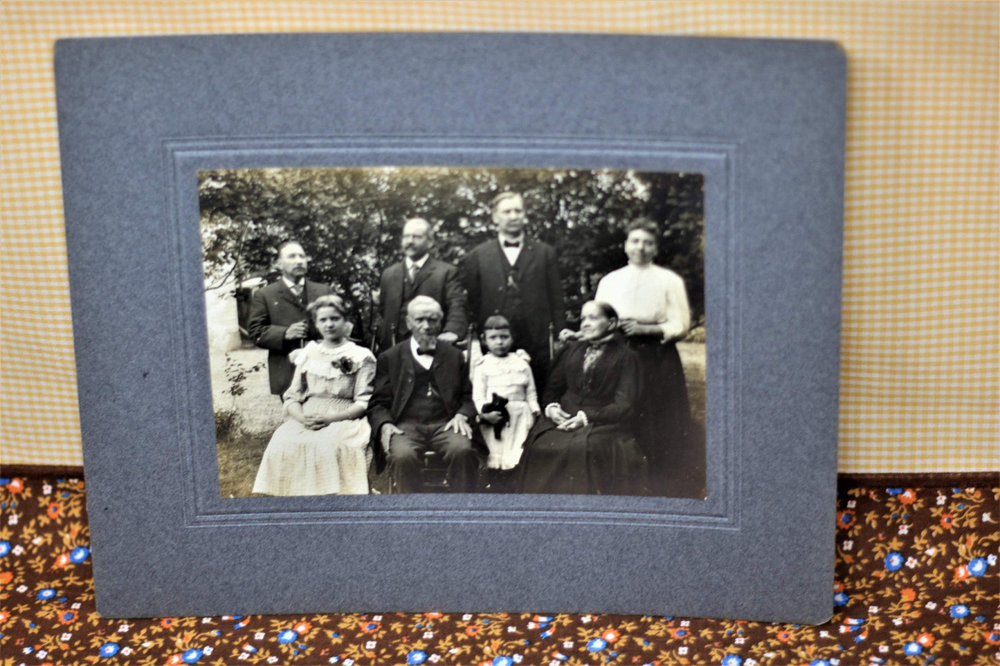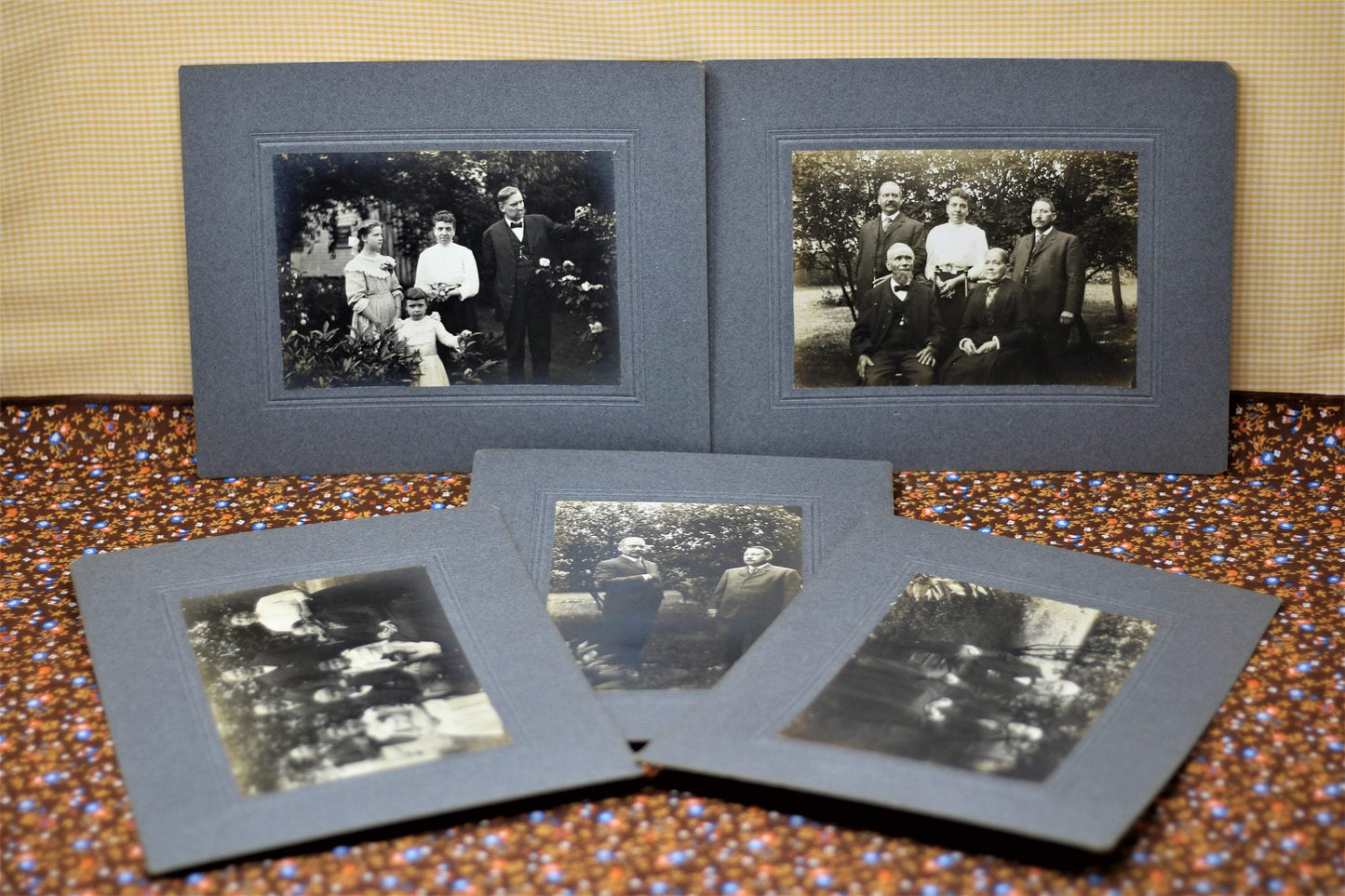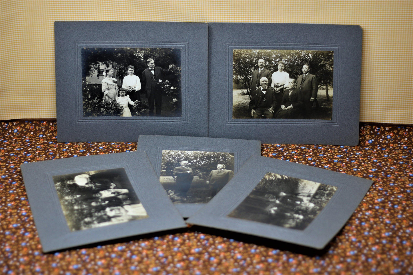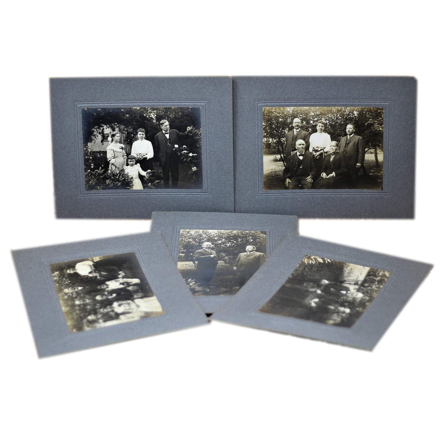 Each photograph features varying members of what appears to be a family; two women, four men, a teen aged girl and a younger girl with her beloved teddy bear. These individuals appear to be posing in a garden/yard outside of a home. The card stock matting is a blueish gray. The photographs are sepia. These photos would look spectacular in some stylized Victorian frames. They would certainly be adored by anyone who loves the Victorian era, haunting photographs, interesting ephemera and/or unique home decor. Please see the pictures provided and let me know if you have any questions!