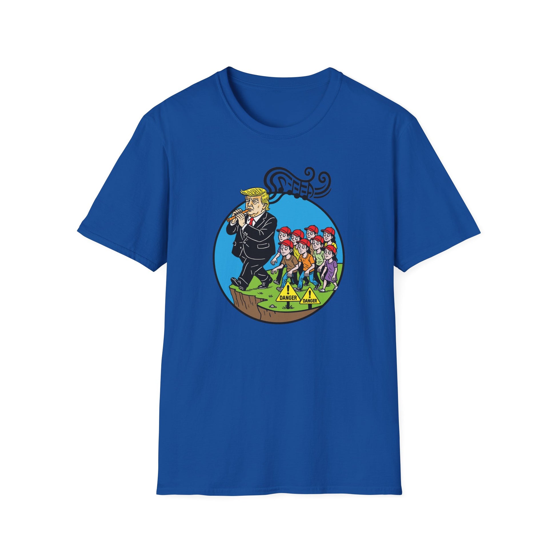 This bold anti-Trump satire shirt uses clever storytelling and symbolic imagery to expose the cult-like devotion behind the MAGA movement. Featuring an illustration of Donald Trump dressed as the infamous Pied Piper, this shirt depicts him leading a group of red-capped, wide-eyed children blindly toward the edge of a cliff. Warning signs litter the scene, but the hypnotized followers remain oblivious as they march toward their own destruction.
