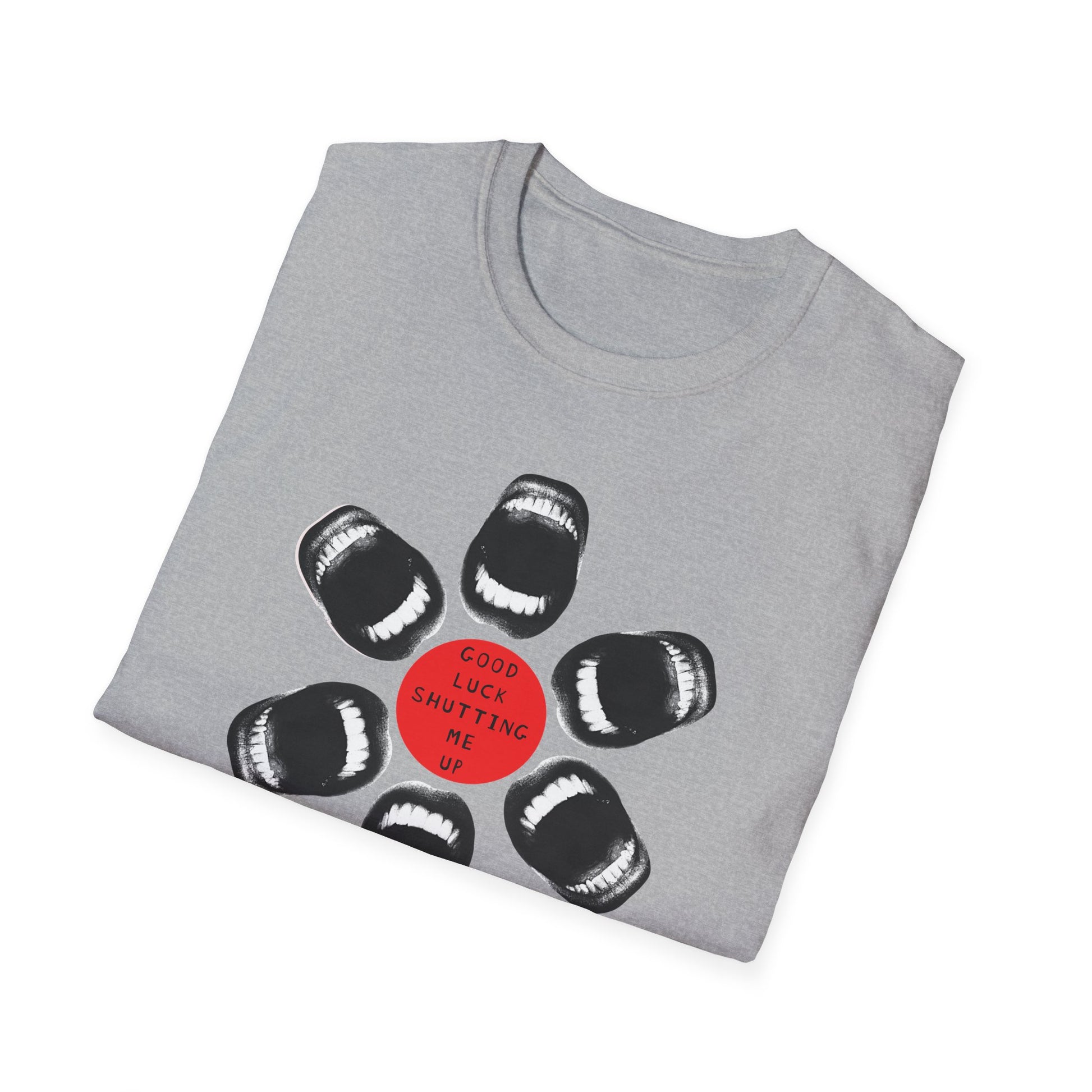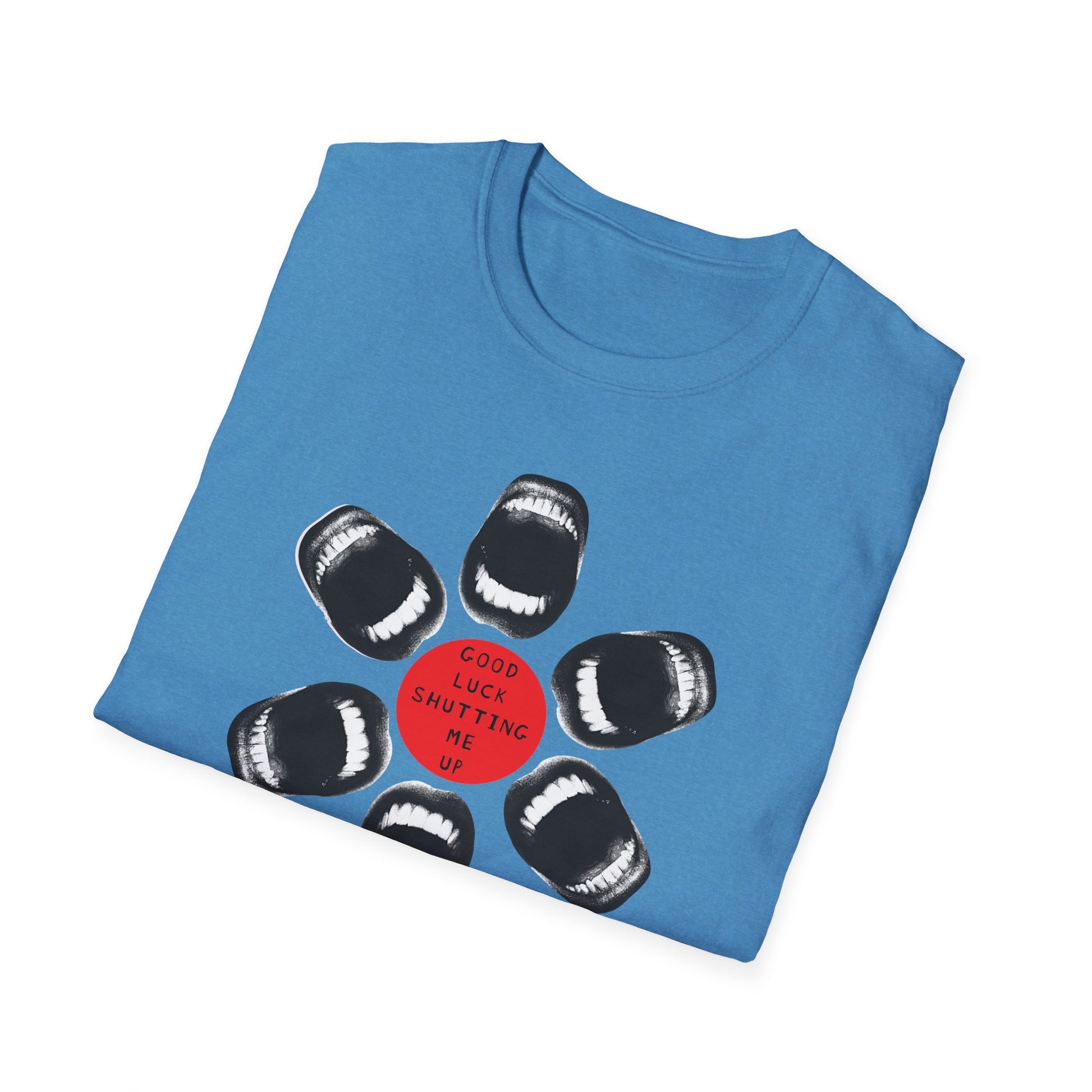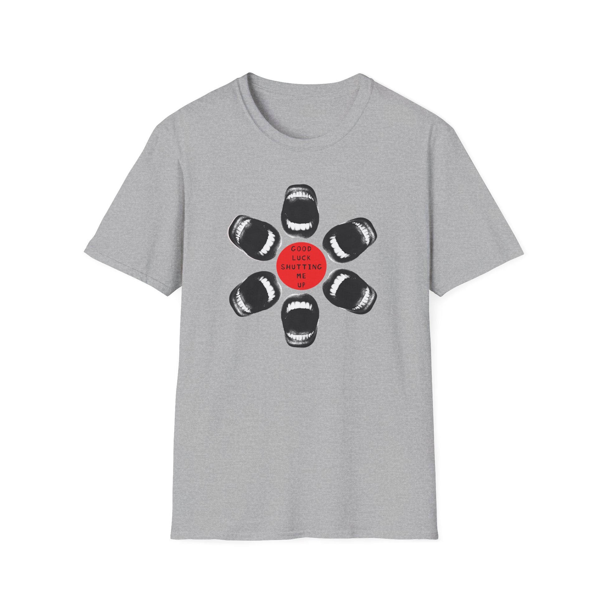 Loud. Proud. Unapologetically outspoken. This shirt dares anyone to try and silence you. With a powerful circular design made entirely of open mouths and the commanding words “Good Luck Shutting Me Up,” this tee is both a battle cry and a badge of resistance.