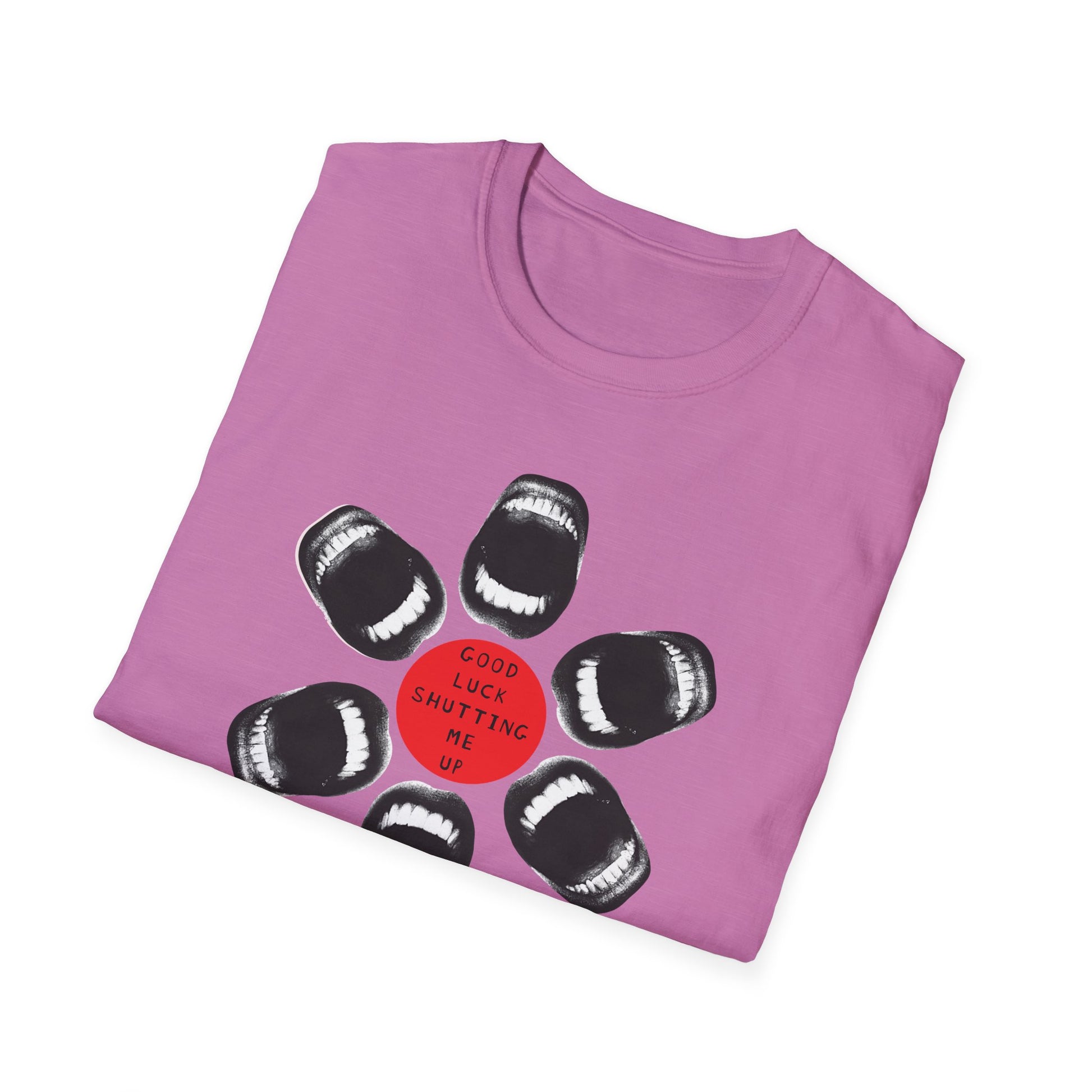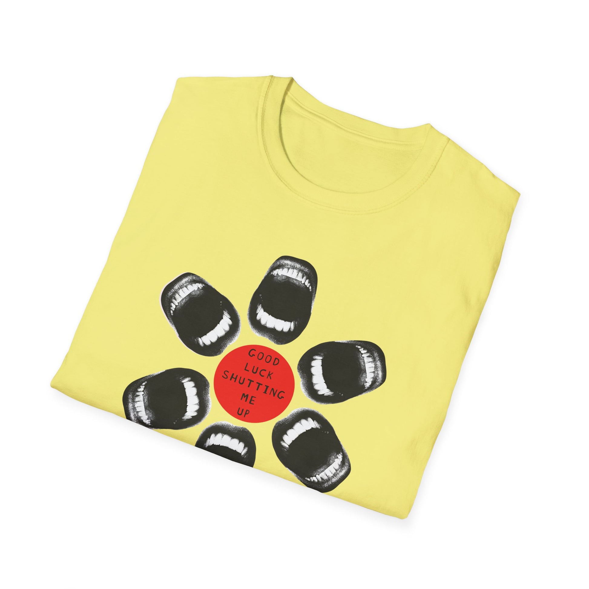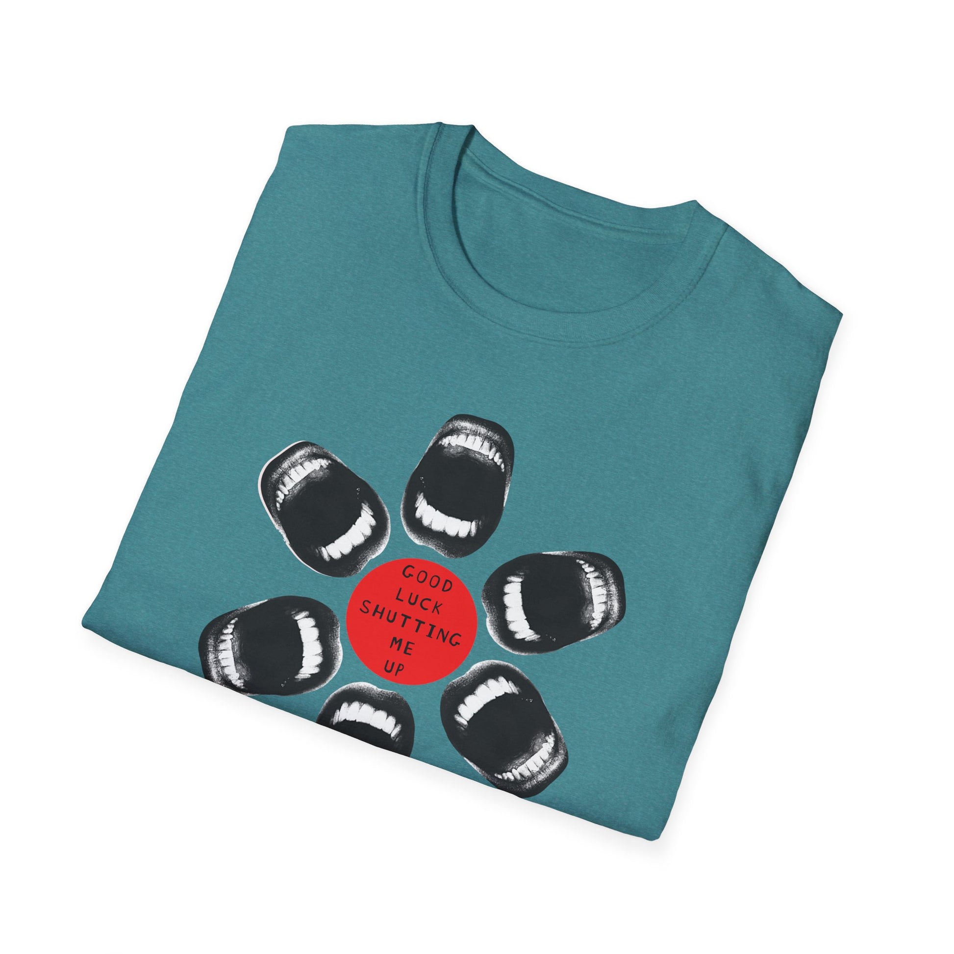 Loud. Proud. Unapologetically outspoken. This shirt dares anyone to try and silence you. With a powerful circular design made entirely of open mouths and the commanding words “Good Luck Shutting Me Up,” this tee is both a battle cry and a badge of resistance.