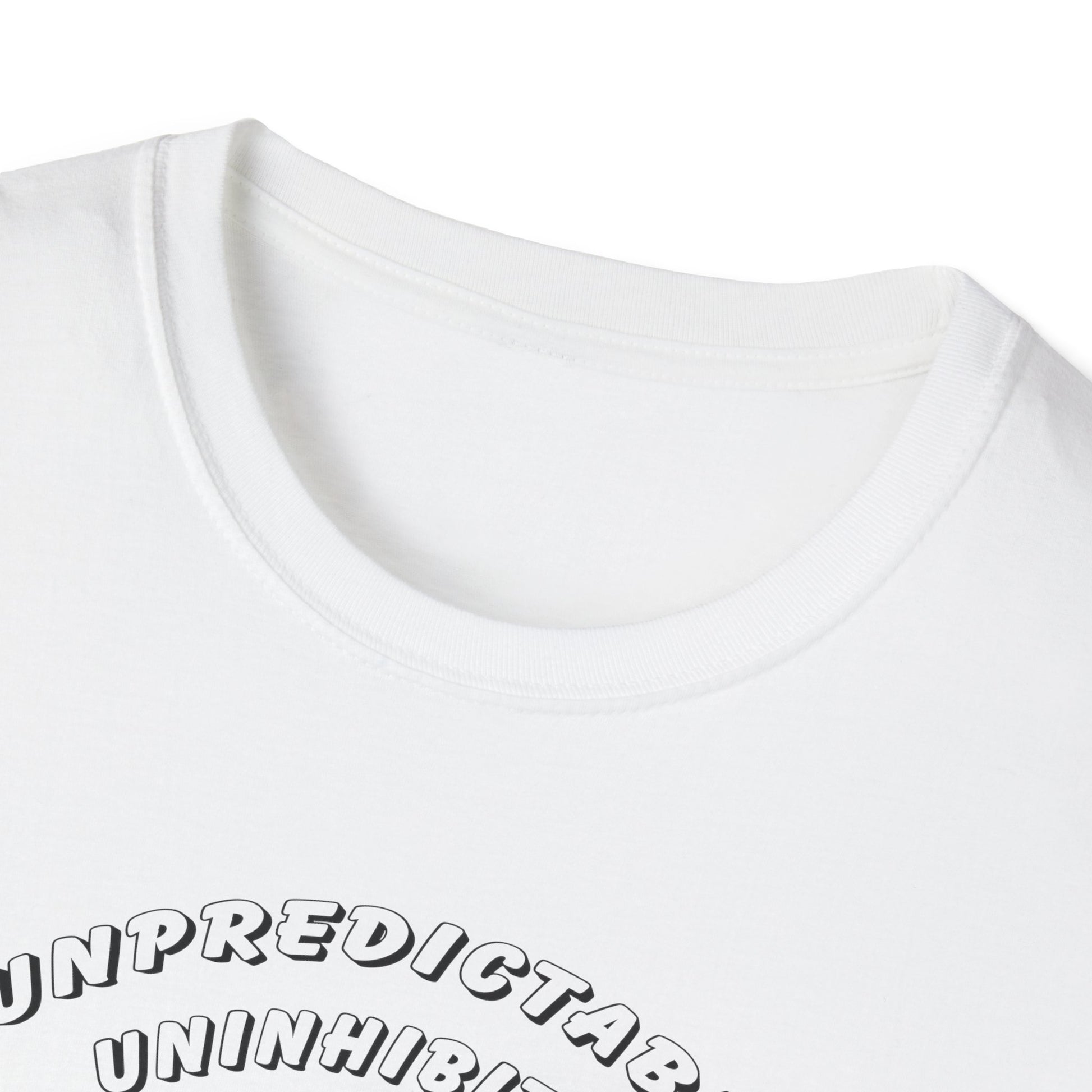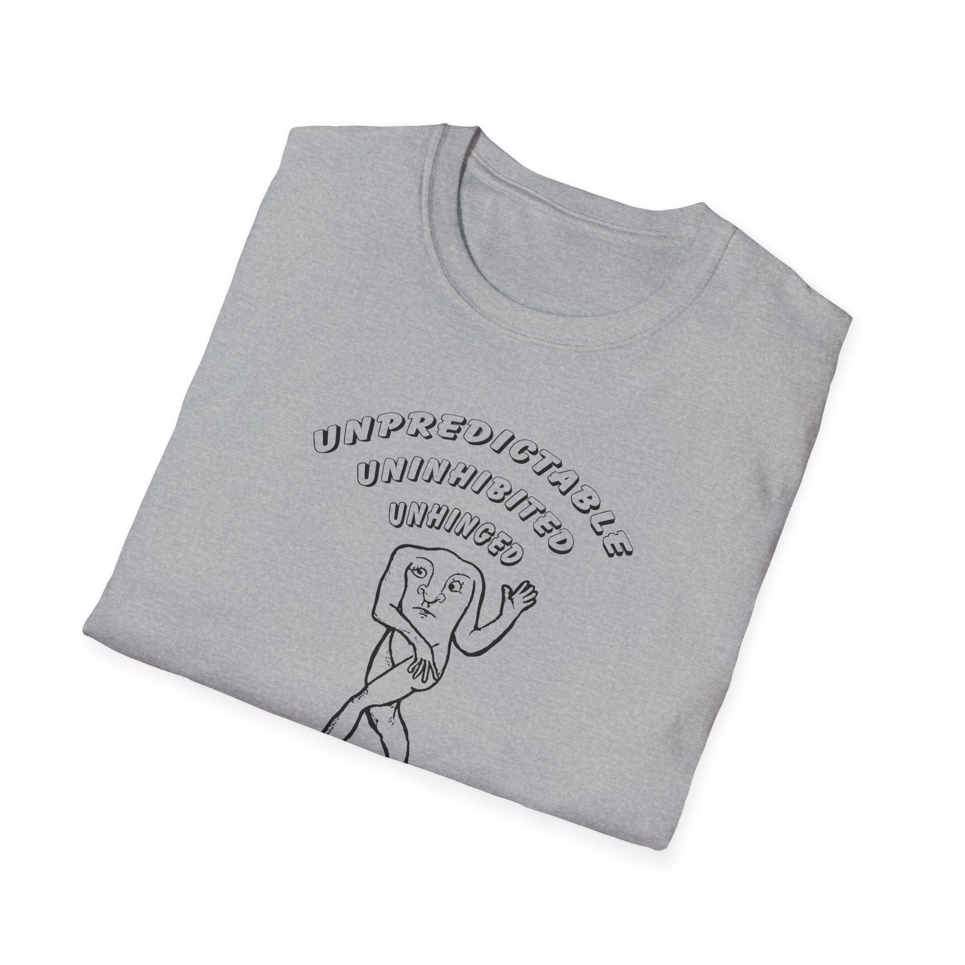 Unleash your inner chaos with this bold and eccentric t-shirt featuring an eye-catching illustration of a Blemmyae – the legendary headless man of medieval lore whose face rests on his chest. With the words "Unpredictable, Uninhibited, Unhinged" emblazoned above the design, this shirt is the ultimate statement piece for those who don't mind being viewed as a ticking time bomb.