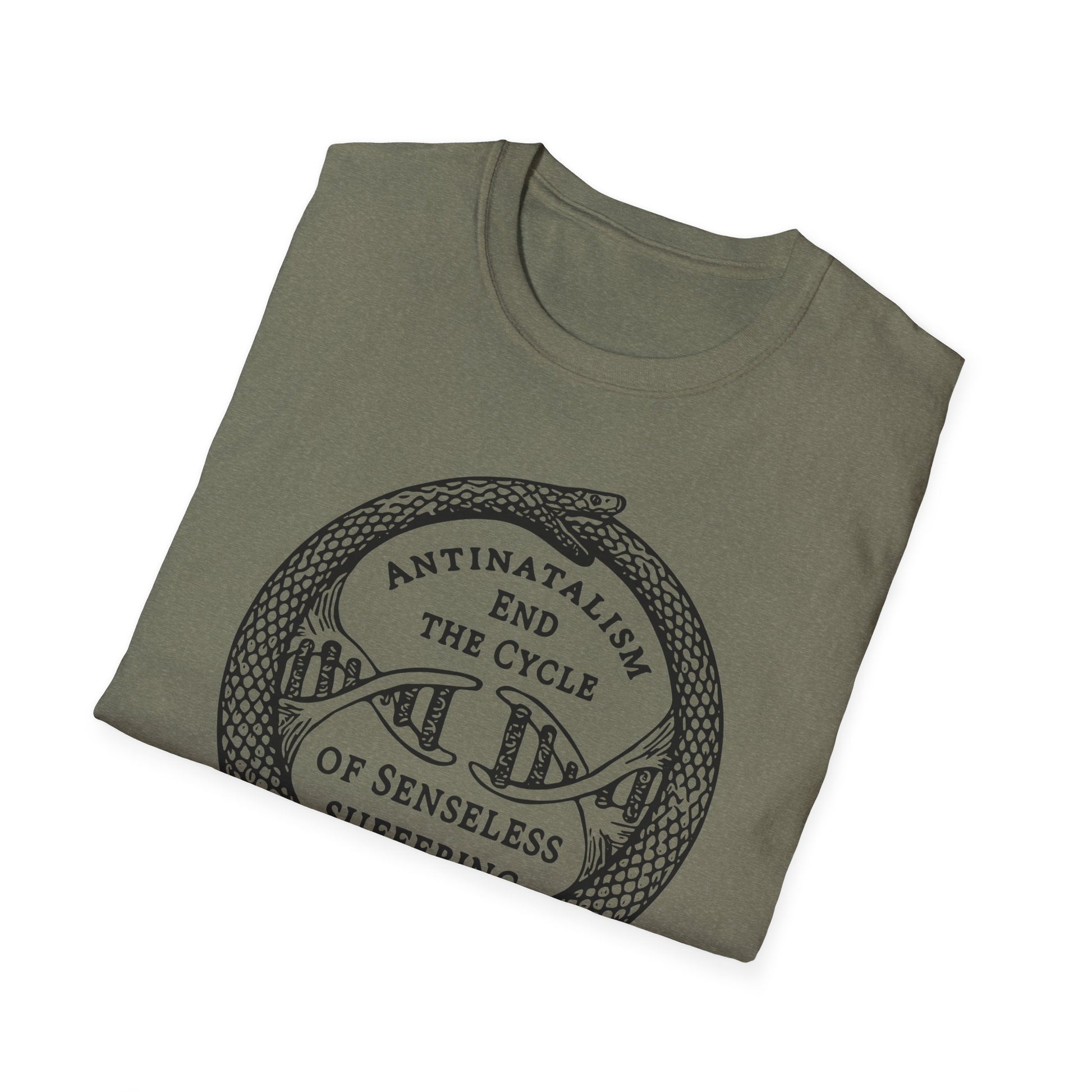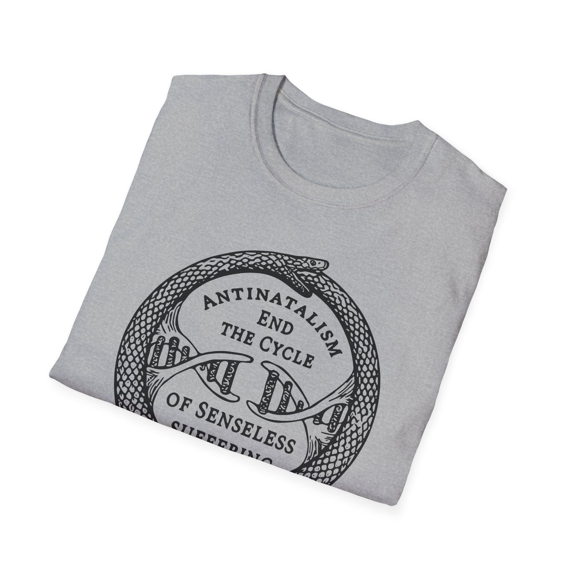 Existence is an endless cycle of suffering, repetition, and survival, encoded into our very DNA. This bold and thought-provoking t-shirt features the ouroboros—the ancient symbol of eternal recurrence—intertwined with the DNA double helix, representing the unbroken chain of sentient suffering passed down through generations. A powerful nod to antinatalism, this design visually challenges the idea that bringing new life into the world is inherently good, instead urging deep reflection on the moral implications of procreation.