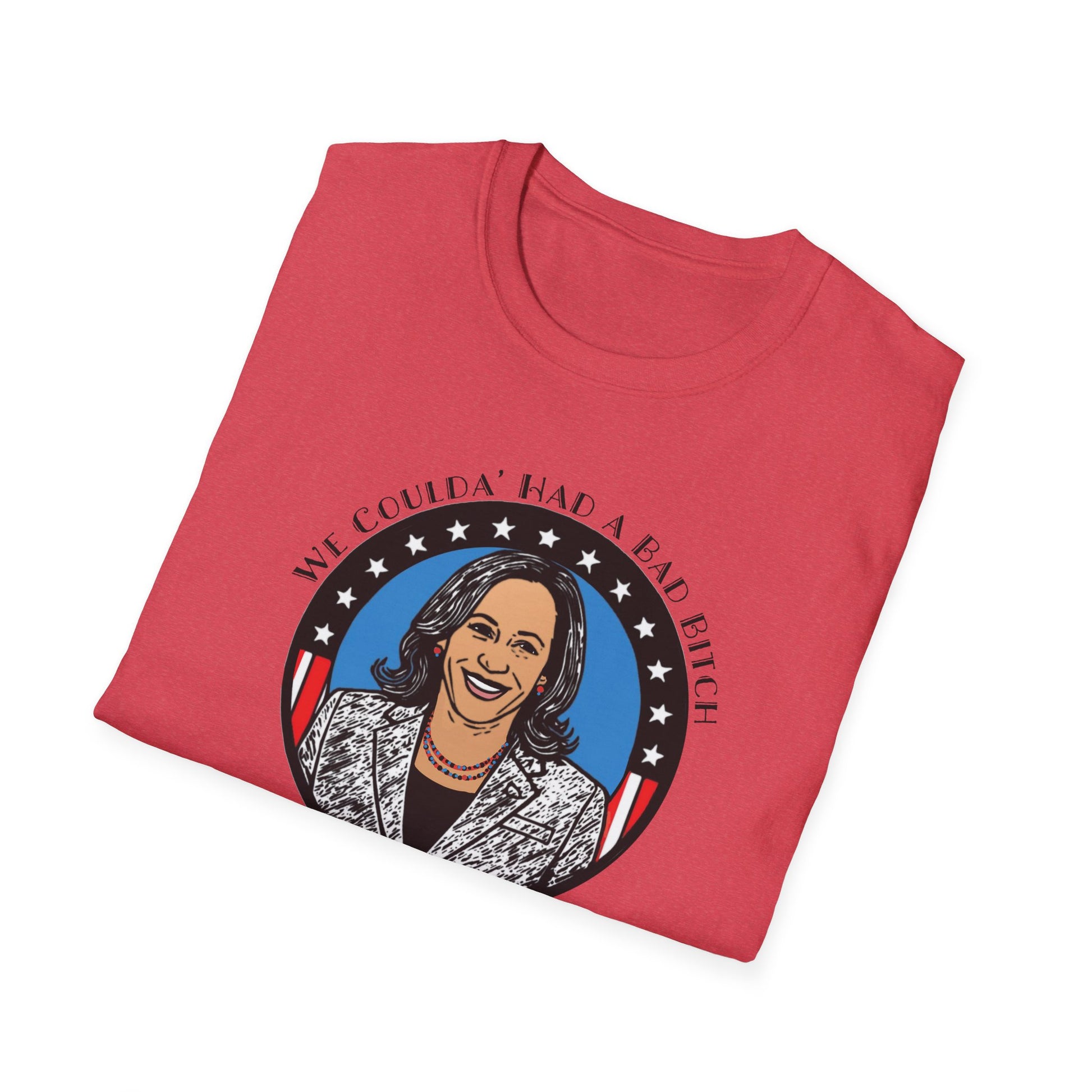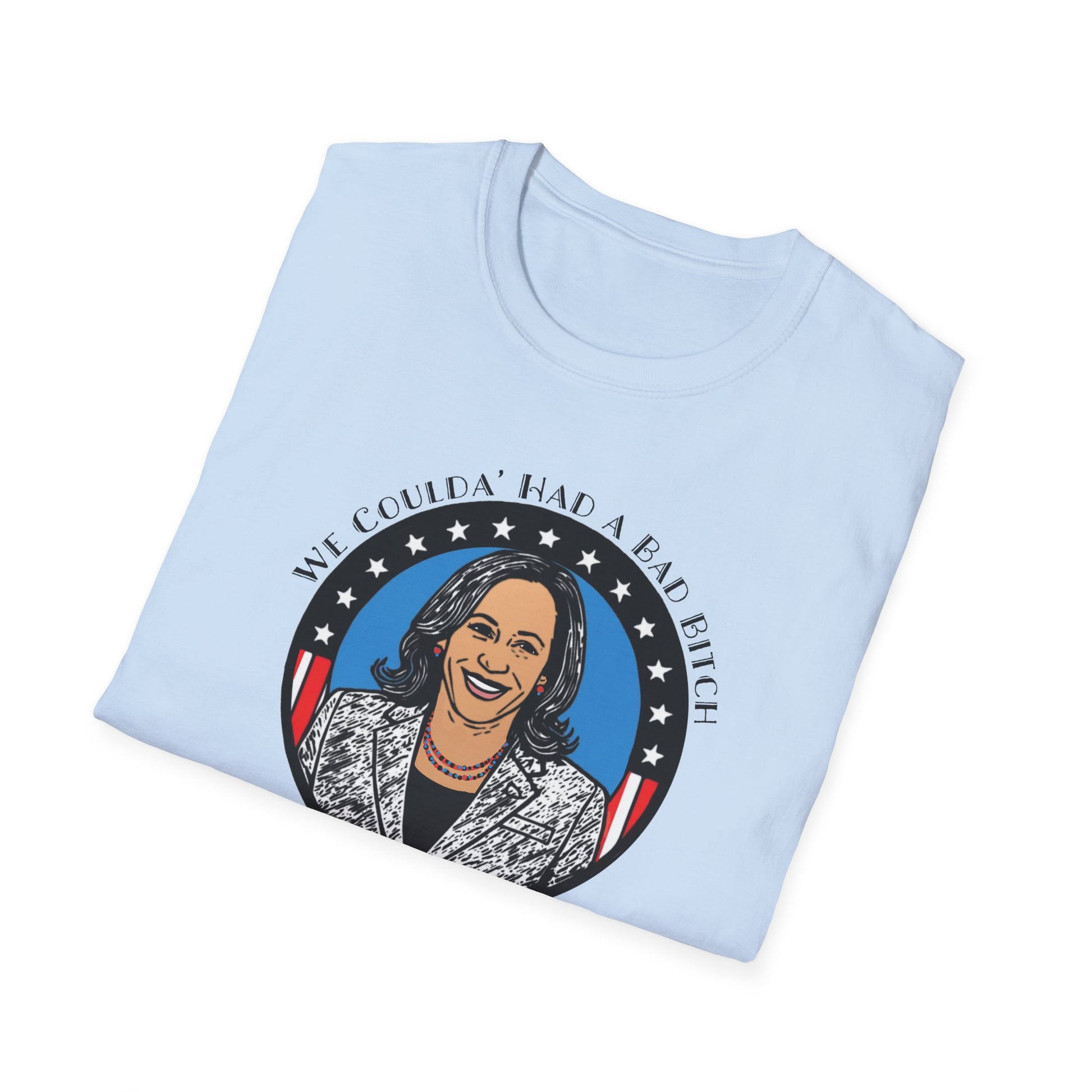 We coulda' had a bad bitch—a capable, qualified leader with integrity. This bold tee features a patriotic portrait of Kamala Harris under the powerful phrase, “We Coulda Had a Bad Bitch,” drawing from Lizzo’s anthem to spotlight a missed opportunity in American politics. This design celebrates what might’ve been: an administration led by a confident, accomplished woman who transformed policy with competence, compassion, and character.
